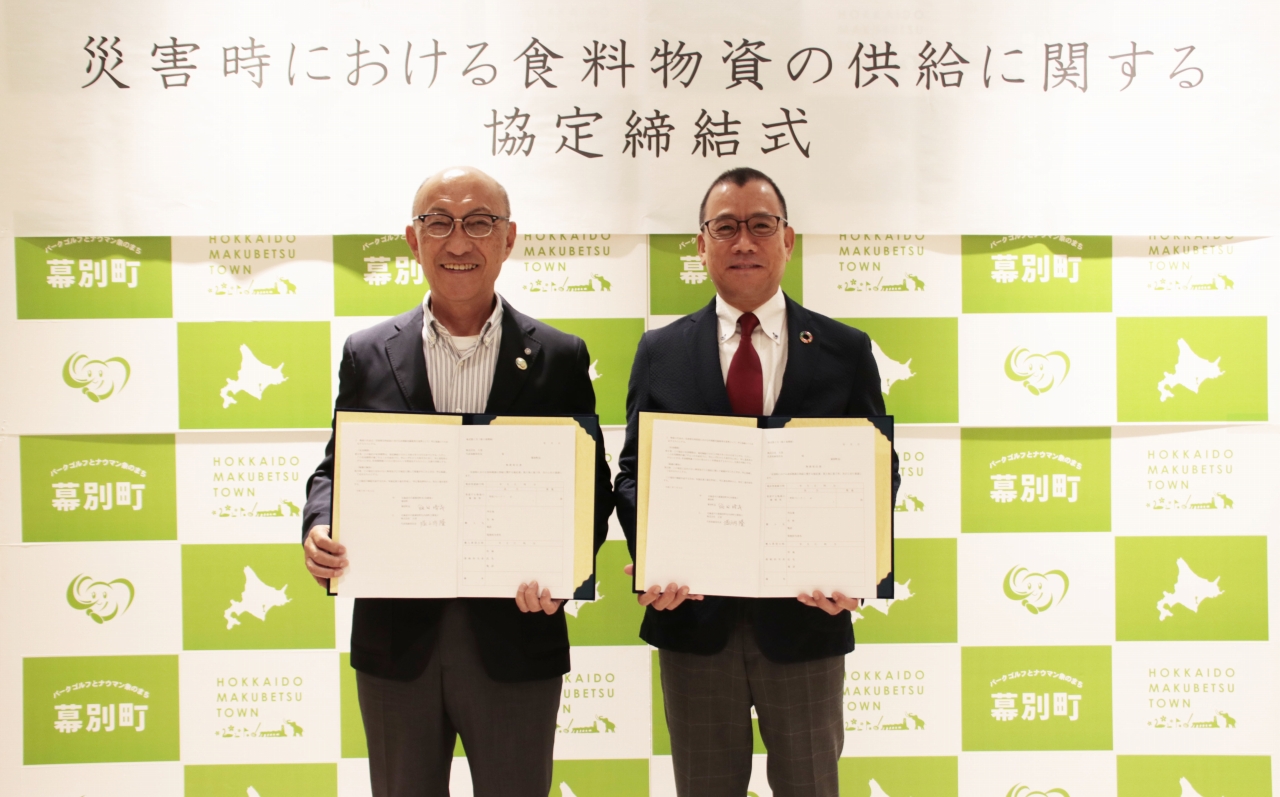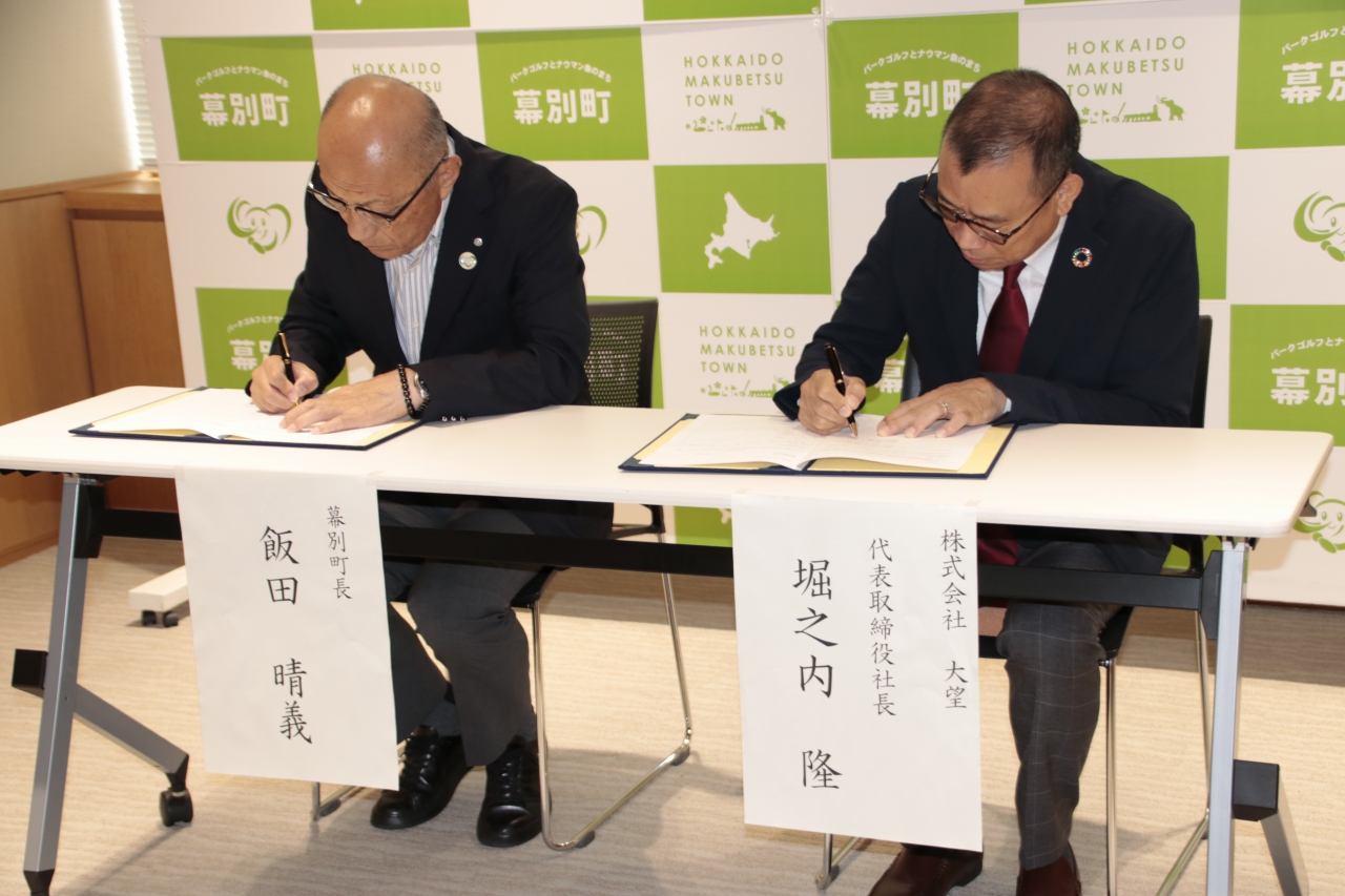 締結式では、幕別町長 飯田晴義 様 と 株式会社大望 代表取締役 堀之内隆が、協定書への署名を行いました。
