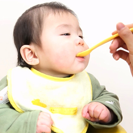 最初はスプーンに慣れてもらうために、一度に口に入れる食べ物はごく少量にし、何回かにわけて与えます。食べ物を口から出してしまうときは、少量を下唇の上にのせるようにしてみてください。